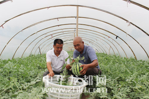 ?? 近日,項(xiàng)城市南頓鎮(zhèn)大棚西瓜基地開園,培育的“半截樓”8428西瓜,因果瓤脆嫩、味甜多汁走俏市場。該基地?fù)碛写笈?0多個(gè),占地面積120多畝,畝均收入2萬多元。圖為該基地工作人員在采摘西瓜。 ?。ǚ簿颁h 攝)