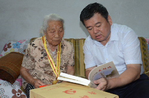 ????徐光一行先后來到抗戰(zhàn)老戰(zhàn)士老同志郭純義、張明鐸、王琪的家中,親切看望慰問他們,把黨和政府對抗戰(zhàn)老戰(zhàn)士老同志的關心傳遞到每個人心中。每到一處,徐光都與他們深入交談,了解他們的生活、起居、身體等情況,與老戰(zhàn)士、老同志一起回憶革命戰(zhàn)爭時期的崢嶸歲月,共話革命精神的傳承,祝愿他們健康長壽、生活幸福。慰問過程中,徐光滿懷崇敬之情,為抗戰(zhàn)老戰(zhàn)士老同志們佩戴由中共中央、國務院、中央軍委聯(lián)合頒發(fā)的“中國人民抗日戰(zhàn)爭勝利70周年”紀念章,送上慰問金和黨史書籍。徐光動情地說:“明天就是中國人民抗日戰(zhàn)爭和世界反法西斯戰(zhàn)爭勝利70周年紀念日,我代表市委、市政府來看望問候你們,并向你們致以崇高的敬意和良好的祝愿??箲?zhàn)年代,廣大老戰(zhàn)士、老同志出生入死、不怕犧牲、英勇奮斗,為奪取抗戰(zhàn)勝利立下了不朽的功勛,你們是人民的英雄、國家的功臣,沒有你們的犧牲奉獻,就沒有我們今天的幸福生活,黨和人民永遠不會忘記你們。紀念抗戰(zhàn)勝利,就是要弘揚偉大的抗戰(zhàn)精神,凝聚起實現(xiàn)周口崛起、富民強市、全面建成小康社會的強大力量,不斷把周口的各項事業(yè)推向前進。”