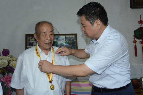 ????劉繼標先后看望了抗戰(zhàn)老戰(zhàn)士王洪蟠、王彥林、代士清、王景明,親手為他們佩戴中共中央、國務院、中共軍委聯(lián)合頒發(fā)的中國人民抗日戰(zhàn)爭70周年紀念章。