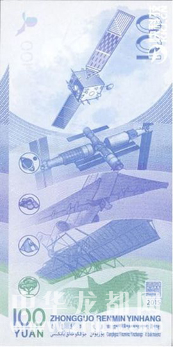 中國(guó)航天紀(jì)念鈔面額為100元,票面長(zhǎng)155毫米,票面寬77毫米,中國(guó)航天紀(jì)念鈔主色調(diào)為藍(lán)色。正面主景圖案為神舟九號(hào)飛船與天宮一號(hào)交會(huì)對(duì)接圖案。左上方為國(guó)徽?qǐng)D案、“中國(guó)人民銀行”行名,其下方為東方紅一號(hào)衛(wèi)星圖案。票面左下方為面額數(shù)字“100”和漢字“壹佰圓”。主景圖案右側(cè)為嫦娥一號(hào)衛(wèi)星圖案,其上方為面額數(shù)字“100”和“中國(guó)航天紀(jì)念”字樣。背面主景圖案由上至下依次為嫦娥一號(hào)衛(wèi)星圖案、2020年中國(guó)空間站“天宮”、噴氣式客機(jī)、馮如2號(hào)雙翼螺旋槳飛機(jī)、飛禽海東青圖案。票面左上角為風(fēng)箏局部圖案,右上角為面額數(shù)字“100”。票面下方為行長(zhǎng)章與年號(hào)“2015”,中國(guó)人民銀行漢語(yǔ)拼音字母和蒙、藏、維、壯四種民族文字的“中國(guó)人民銀行”字樣與面額,面額數(shù)字“100”,漢語(yǔ)拼音字母“YUAN”。
