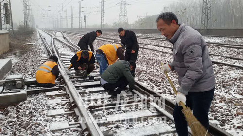 ????11月24日,我市迎來今冬第一場雪。為確保鐵路行車安全,漯阜鐵路有限責(zé)任公司組建黨團(tuán)員突擊隊(duì)清掃道岔積雪,涂油、噴灑防凍液,確保設(shè)備正常運(yùn)轉(zhuǎn),同時在客運(yùn)站臺鋪設(shè)地毯、防滑墊等,防止旅客摔傷。圖為突擊隊(duì)隊(duì)員清掃道岔積雪。