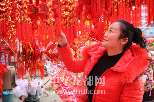 ????2月4日,在項(xiàng)城市水寨辦事處的一家商鋪前,市民正在挑選吊飾。新年臨近,當(dāng)?shù)匕傩占娂姷绞袌?chǎng)上選購(gòu)鮮切花、紅燈籠、中國(guó)結(jié)等節(jié)日飾品。 張永久 攝