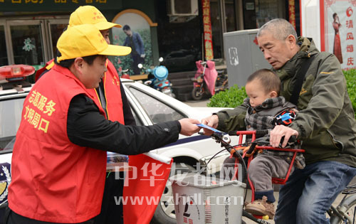 交警向市民發(fā)放宣傳單,呼吁市民文明出行。