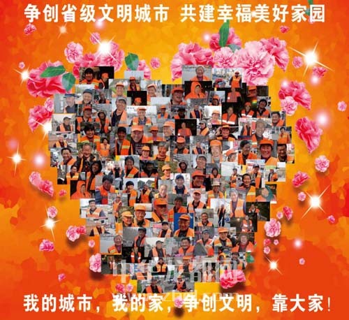 ????本報(bào)訊 經(jīng)過幾個(gè)月的跟蹤拍攝,熱心市民王銀行已為周口中心城區(qū)的300多名環(huán)衛(wèi)工人拍下笑臉和工作照。得知我市目前正在創(chuàng)建省級(jí)文明城市,王銀行特意用這些笑臉照片制作了一組以“我的城市我的家 創(chuàng)建文明靠大家”為主題的宣傳海報(bào)。此外,王銀行的朋友還為環(huán)衛(wèi)工人譜寫一支歌曲。