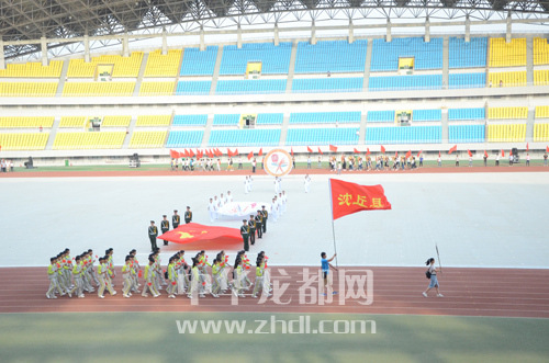 ????9月19日16時許,周口晚報記者在市三運會開幕式整場彩排現(xiàn)場看到,伴隨著主持人宣布彩排開始,國旗、會旗和會徽方陣率先入場,緊隨其后的是來自各縣市區(qū)的97支代表隊方陣(小圖)。當入場式結束所有參與人員離場后,市三運會開幕式文藝演出拉開帷幕。據(jù)了解,文藝演出共分《印象周口》《荷韻悠長》《難以忘槐》《崛起之路》《揚帆遠航》五大篇章?!拔覀儏⒀莸挠形椠?zhí)珮O、龍旗、古箏演奏等6個節(jié)目。”周口文昌中學相關負責人趙志偉說,他們學校共有540人參加市三運會開幕式文藝演出,表演的節(jié)目穿插在五大篇章之中。周口晚報記者了解到,除周口文昌中學外,參加開幕式文藝演出的還有周口幼兒師范學院、周口職業(yè)技術學院衛(wèi)生學院、周口市自行車協(xié)會等多家單位。