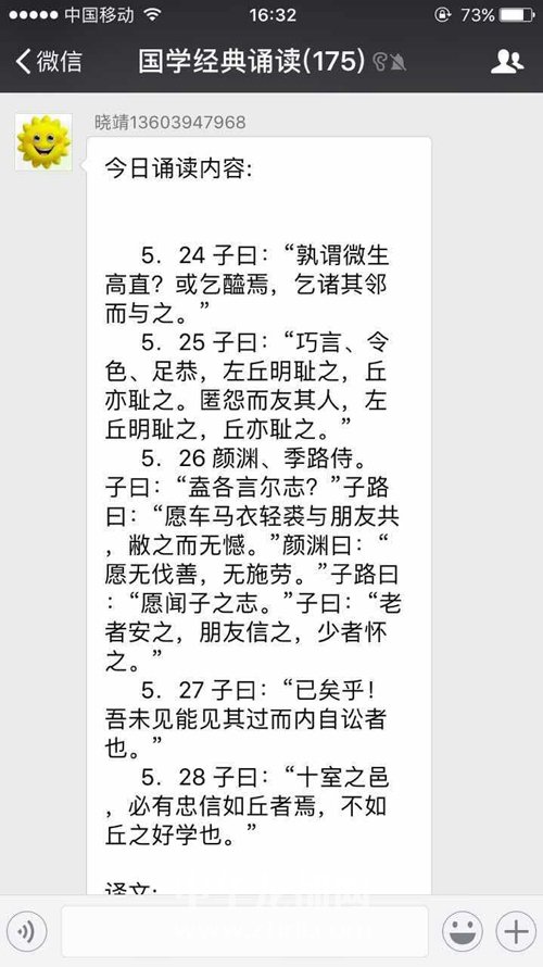 ????建立該微信群的是團(tuán)市委工作人員劉曉靖。劉曉靖告訴周口晚報記者,建立該微信群的目的是想讓大家多讀讀國學(xué)經(jīng)典,增加大家的文學(xué)涵養(yǎng),讓大家養(yǎng)成讀書的習(xí)慣。“剛開始只有十幾個人,大家有些不好意思,有的人覺得自己讀得不好張不開口,我就做一些示范,引領(lǐng)大家誦讀。不久,加入微信群的人多了,通過幾個人帶動,大家誦讀的就多了?!眲跃刚f,讀的方式就是大家通過微信的語音功能,讀一些《論語》中的經(jīng)典句子。過了一段時間,大家對這種方式越來越認(rèn)可,加入該微信群的人也越來越多,人數(shù)從剛開始的十幾個人增加到近200人?,F(xiàn)在,該微信群里不但有電臺、電視臺的專業(yè)主持人,而且有一些學(xué)者。以前拿不準(zhǔn)的字,現(xiàn)在都會有人講解,大家也有了學(xué)習(xí)對象。這個微信群從成立到現(xiàn)在,《弟子規(guī)》、《大學(xué)》、《中庸》、《論語》已讀一遍,四書里面只剩下《孟子》還沒有讀。