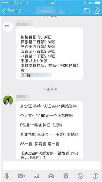 ????記者在前述QQ群里發(fā)現(xiàn),有賣(mài)家給出的“批發(fā)價(jià)格”是:100張內(nèi)3元一張;300張至500張為2.6元一張;500張至800張是2.3元一張;800張至1000張是2.1元一張;千張以上是1.9元一張。