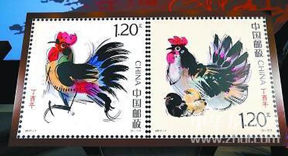 ????????據(jù)了解,《丁酉年》特種郵票由中國當(dāng)代極具影響力的藝術(shù)家韓美林設(shè)計。郵票1套2枚,第一枚名稱為“意氣風(fēng)發(fā)”,是一只奮起奔跑的雄雞形象,象征中國的快速發(fā)展。第二枚名稱為“丁酉大吉”,是一只母雞呵護兩只小雞的溫馨畫面,寓意家庭美滿。