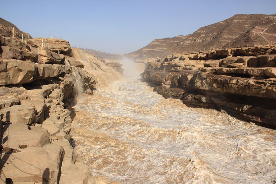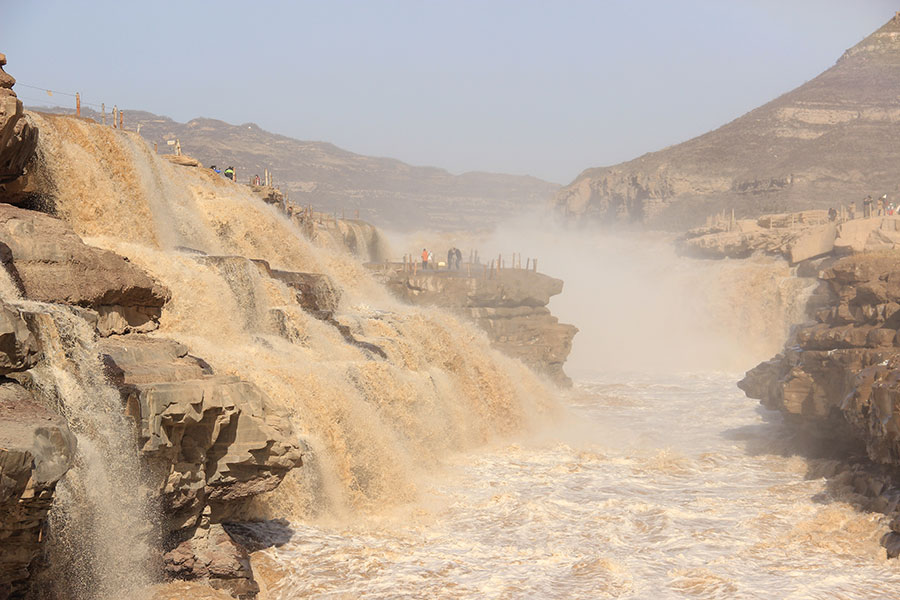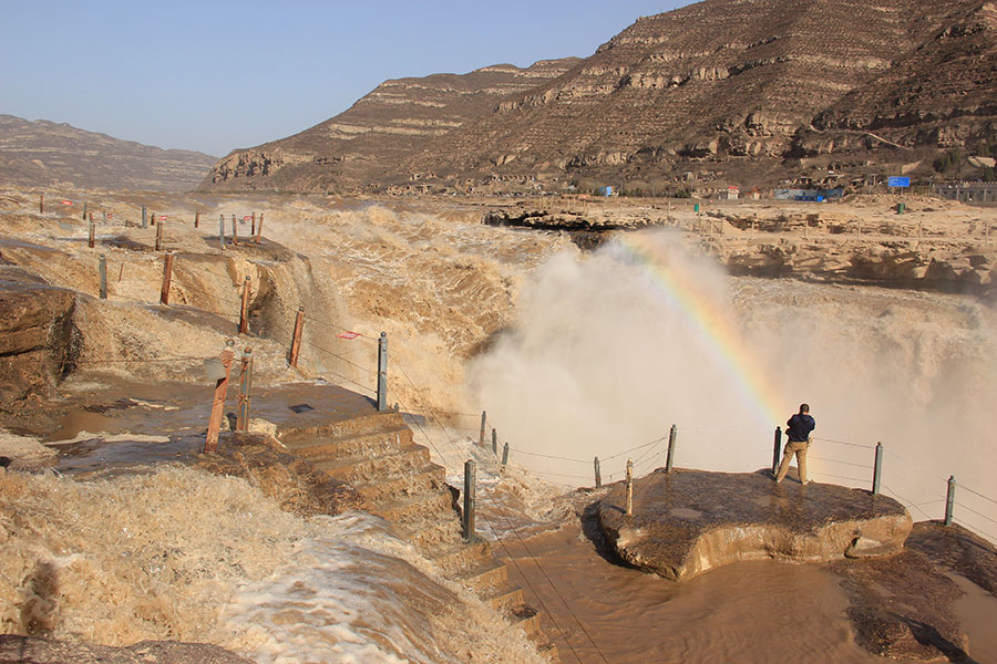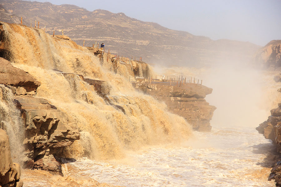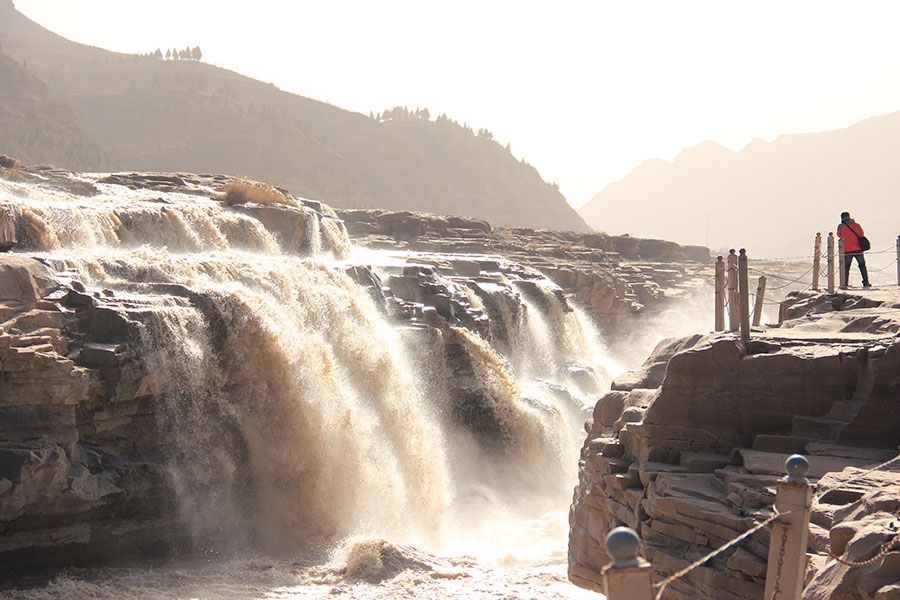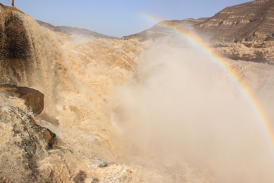 ????黃河壺口瀑布位于宜川縣東35公里處,兩岸高山對峙,黃河穿行于秦晉大峽谷之中,當流至壺口時寬約400多米的河床,突然收縮到四五十米寬,這時河水奔騰怒嘯,山鳴谷應,形如巨壺沸騰,最后從20余米高的斷層石崖飛瀉直下,跌入30余米寬的石槽之中,聽之如萬馬奔騰,視之如巨龍鼓浪,波浪翻滾,驚濤怒吼,震聲數(shù)里。壺口瀑布不同的季節(jié)、不同的時間、不同的水流有著夢幻般的變化,形成了奇絕壯觀的八大景觀:“煙從水底升,船在旱地行,未霽彩虹舞,晴空雨濛濛,旱天鳴驚雷,危巖掛冰峰,海立千山飛,十里走蛟龍。成雪峰/攝