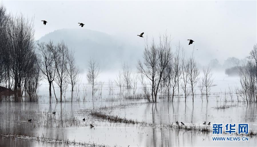 ????1月19日清晨,四只斑頭雁飛行在念湖濕地上空。新華社記者 陳海寧 攝