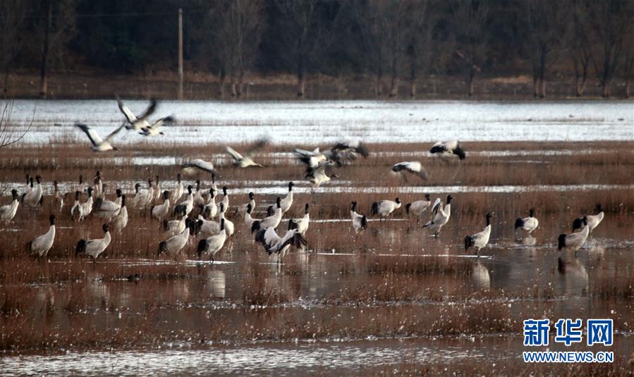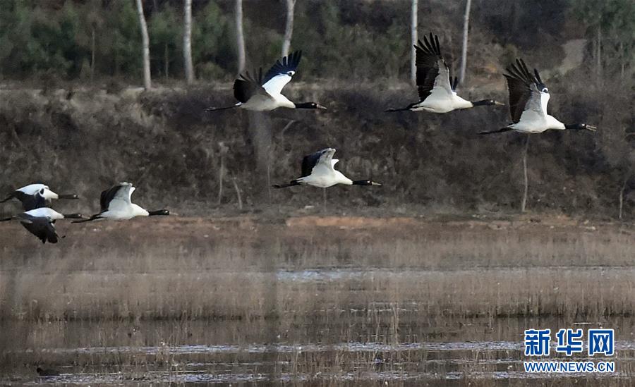 ????1月19日清晨,一群黑頸鶴在念湖濕地飛翔。新華社記者 陳海寧 攝