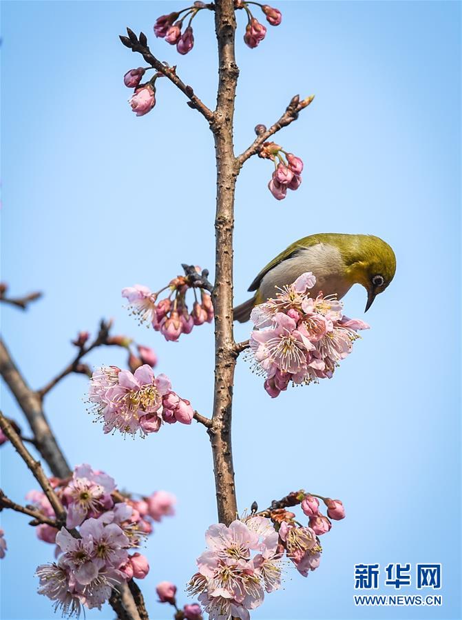 ????2月28日,一只繡眼鳥停在一株櫻花上。近日,天氣回暖,南京中山植物園內(nèi)櫻花盛開。鳥兒與櫻花構(gòu)成春日美景,吸引不少攝影愛好者前來拍照。 新華社記者楊磊 攝