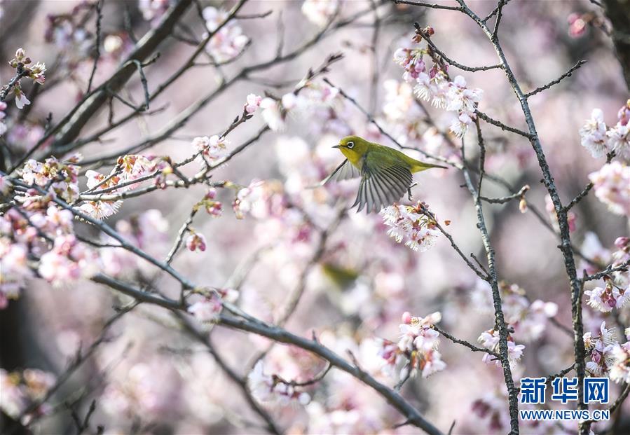 ????2月28日,一只繡眼鳥飛翔在櫻花叢中。