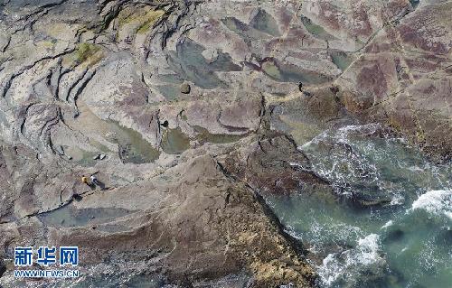 日前,游客在福建省晉江市圍頭村圍頭海角的巖石區(qū)觀賞潮水留下的痕跡。新華社發(fā)(張九強(qiáng) 攝)