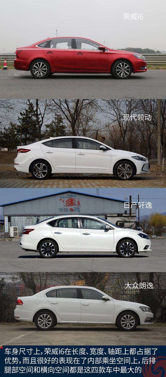 從外觀對比可以看出,四款車型呈現差異較大的設計風格,榮威i6家族式的設計傳遞出“鯨頭燕尾”的特點。0.25cd的超低風阻設計,使車輛擁有更好的空氣動力學。環(huán)翼式橫條幅格柵配上鍍鉻裝飾,前后燈組加入LED光源,給人時尚又富有科技感的視覺感受;而尾部更是具有層次感對于自主品牌來說創(chuàng)新成為其亮點,相比之下朗逸外觀細節(jié)部分加入了運動風格元素,偏向動感,但是長久的大眾臉會讓人有點審美疲勞了。而軒逸在外觀上趨于年輕化,造型小眾,并沒有像i6針對不同年齡段消費者那樣的寬度。