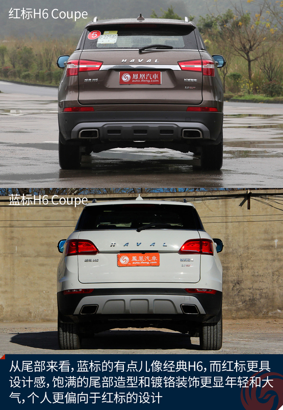 從車尾來看,個(gè)人認(rèn)為新款的紅標(biāo)好像比藍(lán)標(biāo)更加年輕,可能是設(shè)計(jì)年款導(dǎo)致的,新一些的設(shè)計(jì)更加年輕,當(dāng)然也不失沉穩(wěn),不過藍(lán)標(biāo)的H6 Coupe看起來確實(shí)更具個(gè)性。紅標(biāo)更符合大眾的審美。