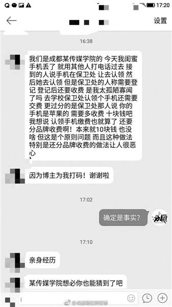????認(rèn)領(lǐng)丟失物品需要交費(fèi),四川傳媒學(xué)院近日設(shè)立的“失物招領(lǐng)費(fèi)”在學(xué)子中引發(fā)爭(zhēng)議。日前,該校黨委宣傳部副部長(zhǎng)孫浩睿告訴北京青年報(bào)記者,學(xué)校并非強(qiáng)制收費(fèi),收取的費(fèi)用將作為對(duì)撿拾者的獎(jiǎng)金。對(duì)此,法律人士表示,制定失物招領(lǐng)收費(fèi)的規(guī)則不違法,但如果校方強(qiáng)制收取,則涉嫌侵犯學(xué)生財(cái)產(chǎn)權(quán),是違法行為。 ????網(wǎng)曝 ????到保衛(wèi)處認(rèn)領(lǐng)丟失手機(jī)需繳費(fèi)10元 ????近日,四川傳媒學(xué)院有學(xué)生在網(wǎng)上爆料稱,自己陪同學(xué)去學(xué)校保衛(wèi)處認(rèn)領(lǐng)丟失的手機(jī)時(shí),保衛(wèi)處的人員稱需要登記并收取費(fèi)用,且不同手機(jī)要分品牌收費(fèi),蘋(píng)果手機(jī)要收費(fèi)10元。 ????四川傳媒學(xué)院一位學(xué)生告訴北青報(bào)記者,他沒(méi)有丟過(guò)東西,但身邊一位同學(xué)確實(shí)曾因丟了一部蘋(píng)果手機(jī),向?qū)W校保衛(wèi)處交了10元的“失物招領(lǐng)費(fèi)”。關(guān)于是否知道學(xué)校設(shè)立了“失物招領(lǐng)費(fèi)”,這名學(xué)生稱“開(kāi)學(xué)第一節(jié)課院長(zhǎng)就在會(huì)議上說(shuō)過(guò)”。 ????4月7日,四川傳媒學(xué)院黨委宣傳部副部長(zhǎng)孫浩睿告訴北青報(bào)記者,學(xué)校設(shè)立“失物招領(lǐng)費(fèi)”, “一方面是對(duì)拾金不昧行為的肯定,另一方面是想利用這種方式給同學(xué)提個(gè)醒,一定注意保管好自己的東西”。 ????孫浩睿向北青報(bào)記者解釋,“失物招領(lǐng)費(fèi)”并不是強(qiáng)制對(duì)學(xué)生收取的,“如果學(xué)生不愿意承擔(dān)這部分費(fèi)用,則由學(xué)校來(lái)承擔(dān)”。 ????對(duì)于學(xué)校設(shè)立“失物招領(lǐng)費(fèi)”。有網(wǎng)友表示理解,認(rèn)為學(xué)校的出發(fā)點(diǎn)是好的,也有人認(rèn)為 “物歸原主是規(guī)則”,不應(yīng)該收取費(fèi)用。此外,也有網(wǎng)友表示,“收錢(qián)不重要,重要的是收的錢(qián)怎么用,怎么做到透明化?”