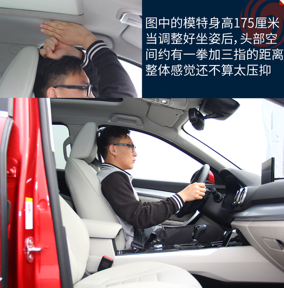 體驗(yàn)者身高175厘米,前排座椅降到最低的時(shí)候頭部還有比較充足的余量,完全不會感覺到壓抑;不過后排頭部就不太行了,頭部距離車頂非常接近,要是身高再高一些的乘客坐進(jìn)后排,已經(jīng)基本上快頂?shù)筋^了。儲物空間中規(guī)中矩,基本上沒有太多讓人驚喜的地方。扶手箱的空間不小,高度也合適,可以放些雜物。