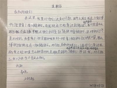 ????孩子的道歉信。 ????揚子晚報訊(記者 張可)南京六朝博物館想尋找一名小觀眾。上月底這個孩子跟著班級春游來博物館參觀時,悄悄拿走了展廳里用于布展的兩塊鵝卵石,幾天后他又帶著道歉信和鵝卵石,回來承認(rèn)錯誤。六朝博物館的工作人員告訴揚子晚報記者,叔叔阿姨們不僅原諒了他,還想表揚孩子身上“知錯就改”的勇氣、精神,并授予他“名譽小館員”的稱號。 ????門口大廳害羞徘徊半天,終于道出實情 ????南京六朝博物館的安保人員小朱最先注意到這個孩子?!?月8日下午,看見他在博物館一樓入口處的大廳站了半天,猶猶豫豫的樣子,上去一問,伸出手遞給我兩塊鵝卵石和一封道歉信。”小朱告訴揚子晚報記者,孩子看上去很害羞,小臉通紅,說要把石頭還回來。 ????原來,今年3月31日,南京一所小學(xué)的幾個班級到六朝博物館參觀,當(dāng)時這個孩子悄悄拿走了展廳里鋪在步道旁的鵝卵石。“其實31日當(dāng)天參觀結(jié)束時,有老師帶著另一個孩子向售票處的工作人員還了一顆鵝卵石并道歉,但兩個孩子不是同一個人?!绷┪镳^的工作人員介紹,后來在監(jiān)控視頻回看發(fā)現(xiàn),這名送道歉信的孩子是當(dāng)天媽媽騎著電動車送來的,媽媽一個人在門口的人行道上等著,讓孩子自己進去說。 ????孩子的道歉信寫得質(zhì)樸而真切?!霸谶@里,我要對你們說聲對不起……我不應(yīng)該不經(jīng)過你們的同意就隨便地拿走鵝卵石……如果每個游客都和我當(dāng)時一樣拿了鵝卵石就放進口袋,那么博物館將沒有一塊鵝卵石……請你們原諒我,對不起了,我以后在(注:原文如此)也不會這么做了?!?/p>