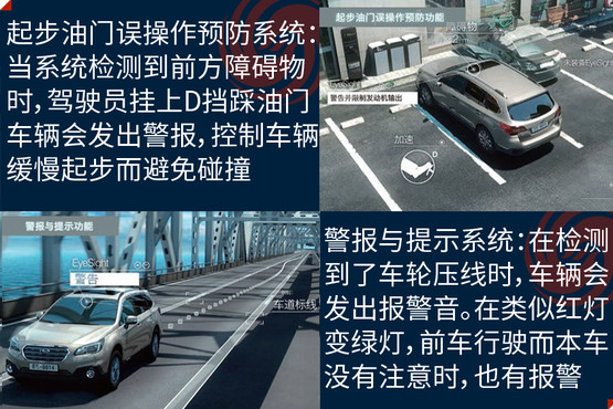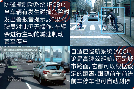 EyeSight駕駛輔助系統(tǒng)是避免事故發(fā)生,此次在中國市場亮相是它的第三代產品,其主要亮點是通過兩個模擬人眼的立體攝像頭,來監(jiān)控距離車輛前方100米以內,高度在1米以上的人、車輛和物體,以減少傷害為目的的駕駛輔助系統(tǒng);除了距離以外,還可以對方向、高度大小等指標進行識別。它的主要功能分為四大類,分別是防碰撞制動系統(tǒng)(PCB)、車速自適應巡航控制系統(tǒng)(ACC)、起步油門誤操作預防系統(tǒng)和警報與提示系統(tǒng)。