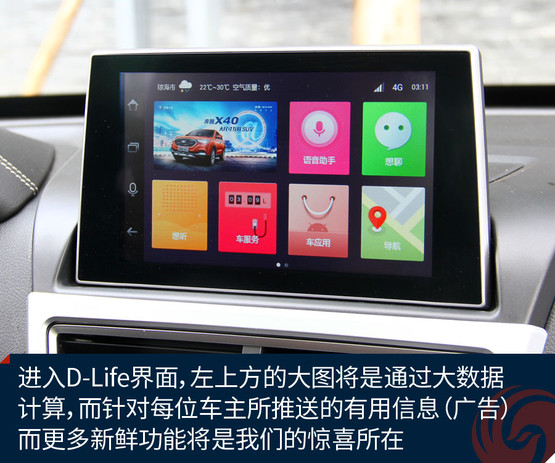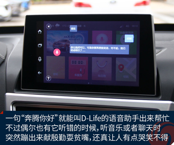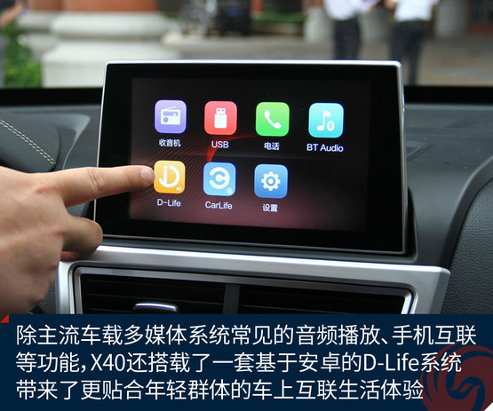 不過(guò)跟奔騰X40接觸兩天之后,會(huì)發(fā)現(xiàn)它大可不必在對(duì)手林立的市場(chǎng)中血拼顏值,靠實(shí)力不俗的獨(dú)門(mén)絕技一樣能夠輕松獲得一席之地。既然面向年輕用戶,豐富的車載娛樂(lè)系統(tǒng)很關(guān)鍵。大屏幕、手機(jī)互聯(lián)等等似乎已經(jīng)是這類車的標(biāo)配。奔騰X40更進(jìn)一步,所搭載的D-Life系統(tǒng)讓我們看到了它引領(lǐng)潮流的勁頭。