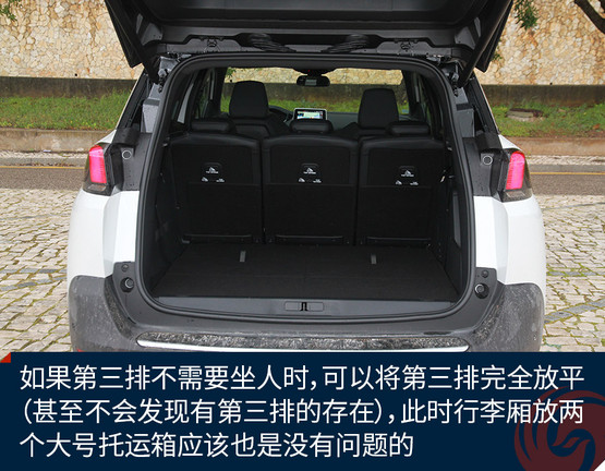 標(biāo)致5008提供了三排座椅還有另外一個(gè)顯著的好處是,可以豐富行李廂的使用方式。通過(guò)實(shí)際體驗(yàn)可以發(fā)現(xiàn),當(dāng)三排座椅全部立起時(shí),標(biāo)致5008的行李廂基本能夠放下兩個(gè)登機(jī)箱,但如果第三排不需要坐人時(shí),可以將第三排完全放平(甚至不會(huì)發(fā)現(xiàn)有第三排的存在),此時(shí)行李廂放兩個(gè)大號(hào)托運(yùn)箱應(yīng)該也是沒(méi)有問(wèn)題的。