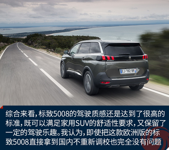 綜合來(lái)看,標(biāo)致5008的駕駛質(zhì)感還是達(dá)到了很高的標(biāo)準(zhǔn),既可以滿(mǎn)足家用SUV的舒適性要求,又保留了一定的駕駛樂(lè)趣。我認(rèn)為,即使把這款歐洲版的標(biāo)致5008直接拿到國(guó)內(nèi)不重新調(diào)校也完全沒(méi)有問(wèn)題。