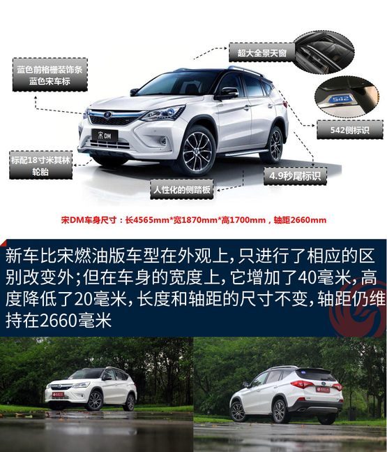 ????????外觀方面,宋DM與燃油版車型基本保持一致,其延續(xù)了X形的前臉造型設(shè)計,整個前臉時尚、運動。而在一些細節(jié)上,它與唐100一樣,都有新能源車型專屬的特征,車身D柱處還標(biāo)有比亞迪“542”標(biāo)識,并在車尾部標(biāo)有“4.9s”標(biāo)識,強調(diào)了該車型的動力系統(tǒng)較為強大。車身尺寸方面,宋DM車型的長寬高分別為4565×1870×1700毫米,軸距為2660毫米。