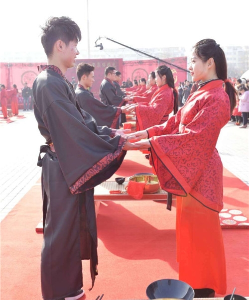 記者在現(xiàn)場(chǎng)看到,16對(duì)新人在司儀的引導(dǎo)下,采用中國古典婚禮儀式,有牽紅線、結(jié)發(fā)、拜天地等程序,儀式簡(jiǎn)單而隆重,新人家屬、1000多名市民圍觀見證了新人喜結(jié)連理。