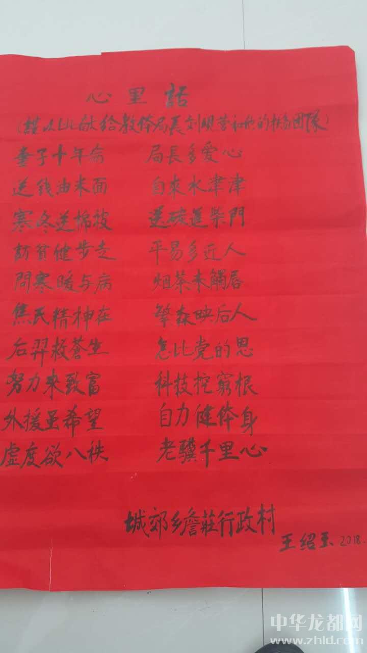 “我推敲了幾個半夜,寫了《心里話——謹以此獻給教體局局長劉現(xiàn)營和他的扶貧團隊》這首五言排律,表表我和老伴及全村對您的感激之情?!薄捌拮邮瓴?,局長多愛心。送錢米油面,自來水津津。寒冬送棉被,送炭至柴門。訪貧健步走,平易又近人。”王紹玉聲情并茂地朗讀著,劉局長爽朗地笑了,“老伴劉桂蘭藥按時吃了嗎?”“按時吃了,多虧您,到我家宣講扶貧政策,幫助我聯(lián)系有關(guān)單位,我老伴享受了慢性病醫(yī)保。”“桂蘭說,人家劉局長隔三差五給咱送米面油,逢年過節(jié)給咱送慰問金,前幾天頂風(fēng)冒雪送來兩床被子,一年不知來了多少趟,待咱比親人還親??!我家也沒有什么拿出手的,我倆一合計,就發(fā)揮我的一點專長,給您寫了首詩,您經(jīng)常去我家噓寒問暖,我今個也來您這,算是走走親戚吧,回報回報您!”