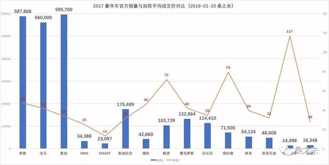 銷售的數(shù)量固然重要,但是銷售質(zhì)量也是評(píng)估銷售力不能忽視的重要指標(biāo)。衡量銷售質(zhì)量,“加權(quán)平均成交價(jià)”和“單車?yán)麧?rùn)”這兩個(gè)重要參數(shù),也許讓我們更直觀的看到車企的銷售能力與經(jīng)銷商單店經(jīng)營(yíng)質(zhì)量。這些更微觀的數(shù)據(jù)往往更能反映銷售公司及其經(jīng)銷商體系的銷售能力及水平?!凹訖?quán)平均成交價(jià)”反映車企的產(chǎn)品力與銷售公司的銷售能力,車企賣掉的車越多,單車價(jià)格越貴,品牌就越具有競(jìng)爭(zhēng)力,反之就需要考慮改進(jìn)產(chǎn)品,提升銷售管理能力。“單車?yán)麧?rùn)”指經(jīng)銷商銷售新車獲取的利潤(rùn),不含衍生利潤(rùn),一般在-4%-7%之間,如果單車?yán)麧?rùn)超過-2%,廠家需要考慮對(duì)經(jīng)銷商進(jìn)行補(bǔ)貼,如果利潤(rùn)超過7%,車企就會(huì)調(diào)整經(jīng)銷商浮動(dòng)返利。下面我們通過這兩個(gè)指標(biāo),來看哪些豪華車品牌在2017年表現(xiàn)更具實(shí)力。
