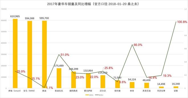 以官方披露的銷量口徑計(jì)算,奔馳(含smart)全年銷量為610,965輛,增長(zhǎng)25.9%,成為中國市場(chǎng)首家銷量超過60萬輛的豪華車品牌,銷售總量名列第一;奧迪全年銷量為595,700輛,增長(zhǎng)1.1%;寶馬(含Mini)全年銷量為594,388輛,增長(zhǎng)15.1%。如果按單一品牌統(tǒng)計(jì),奧迪品牌銷量為595,700輛,寶馬品牌為56萬輛,奔馳品牌(含v級(jí)車)為587,868輛,奧迪品牌蟬聯(lián)2017年中國豪華車第一。