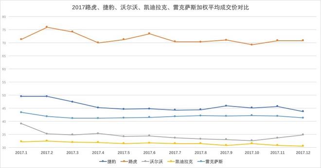 凱迪拉克、捷豹路虎、雷克薩斯、沃爾沃四個(gè)品牌銷量在10萬輛以上為第二陣營(yíng)。除路虎外,捷豹因進(jìn)口F-pace帶動(dòng)其成交價(jià)上揚(yáng),隨著XE國產(chǎn)上市銷售,捷豹銷量有望進(jìn)一步增長(zhǎng),價(jià)格進(jìn)一步下探;以銷售進(jìn)口車型為主的雷克薩斯,今年銷量質(zhì)量不錯(cuò),庫存時(shí)間短,資金周轉(zhuǎn)快,多數(shù)以訂單方式銷售,加權(quán)平均價(jià)在42萬上下,成交價(jià)格走勢(shì)平穩(wěn),經(jīng)銷商今年利潤(rùn)也很豐厚。沃爾沃在新款車型的帶動(dòng)下,成交價(jià)格開始上揚(yáng);凱迪拉克今年銷量增速較快,通過下圖我們可以看到,凱迪拉克基本依靠低價(jià)獲取銷量的增長(zhǎng),成交價(jià)格進(jìn)一步走低,經(jīng)銷商的利潤(rùn)需要依靠廠家補(bǔ)貼。