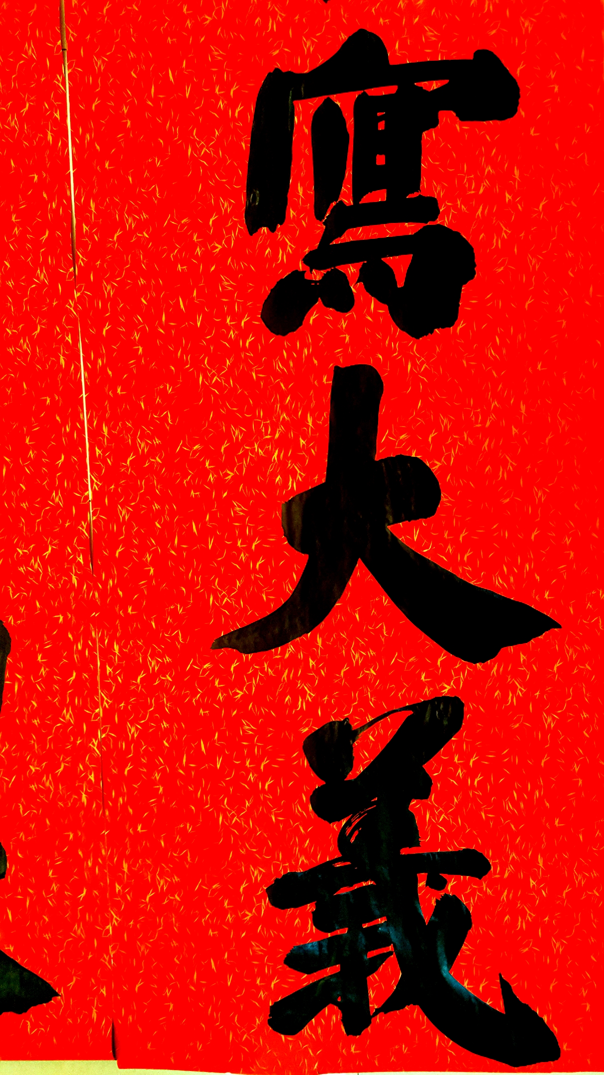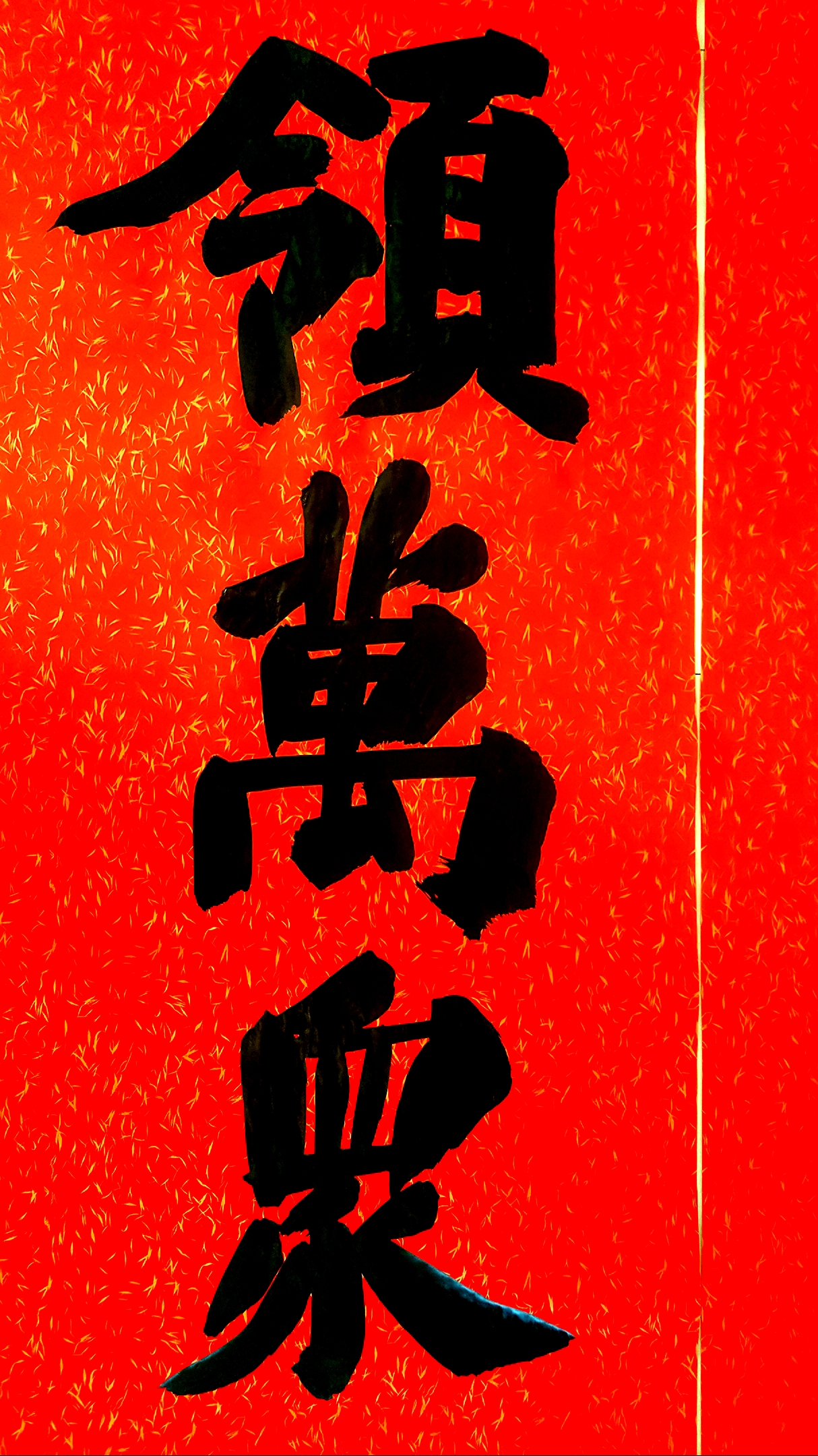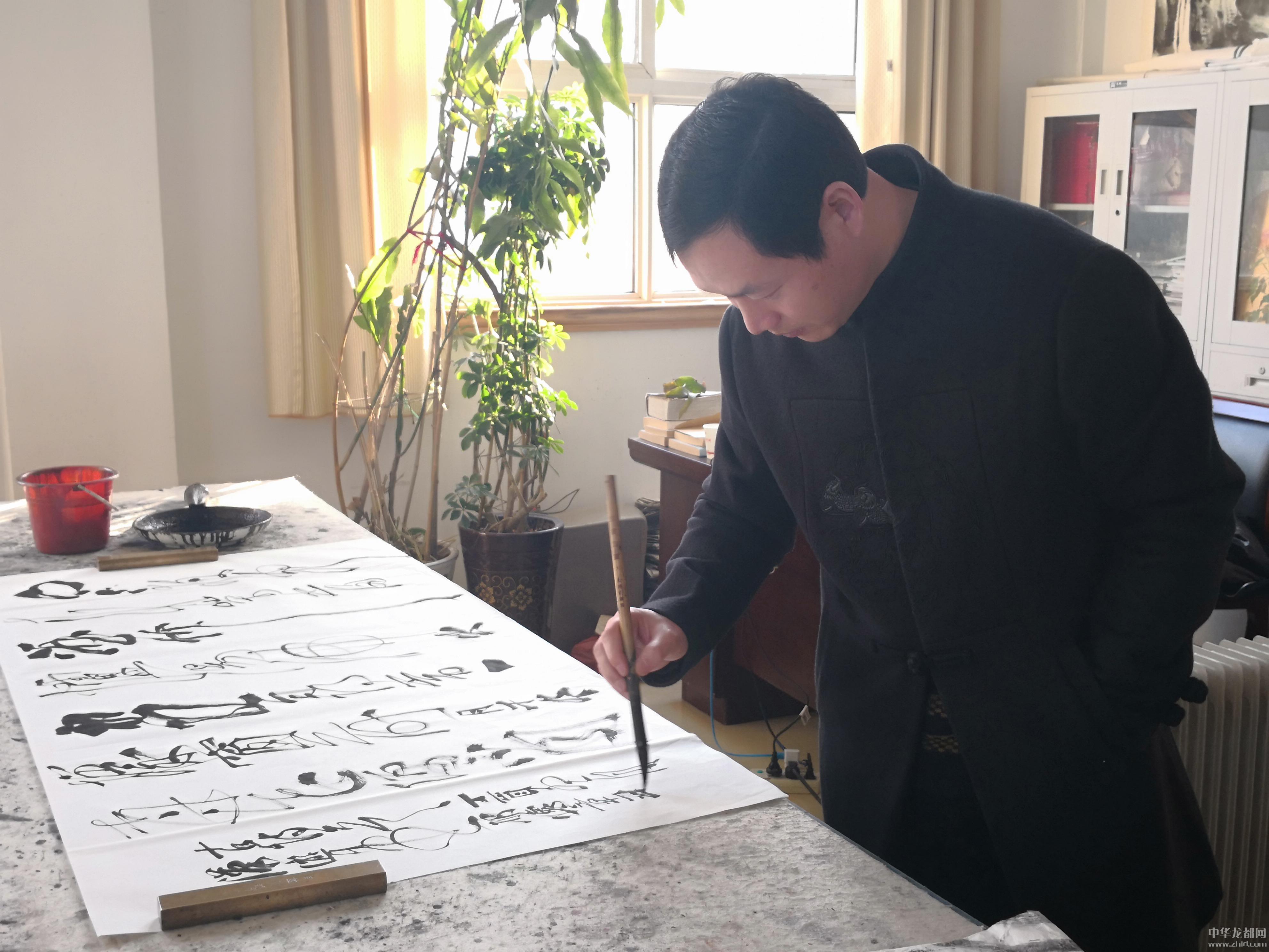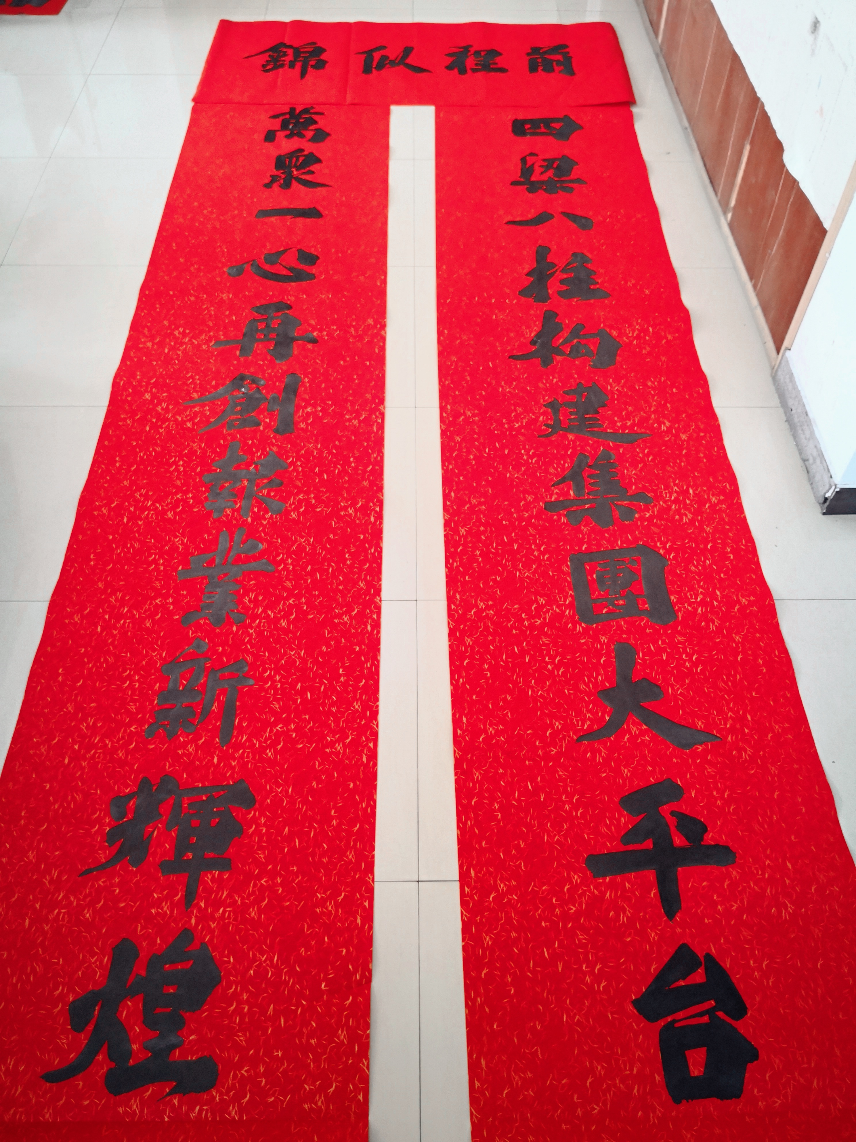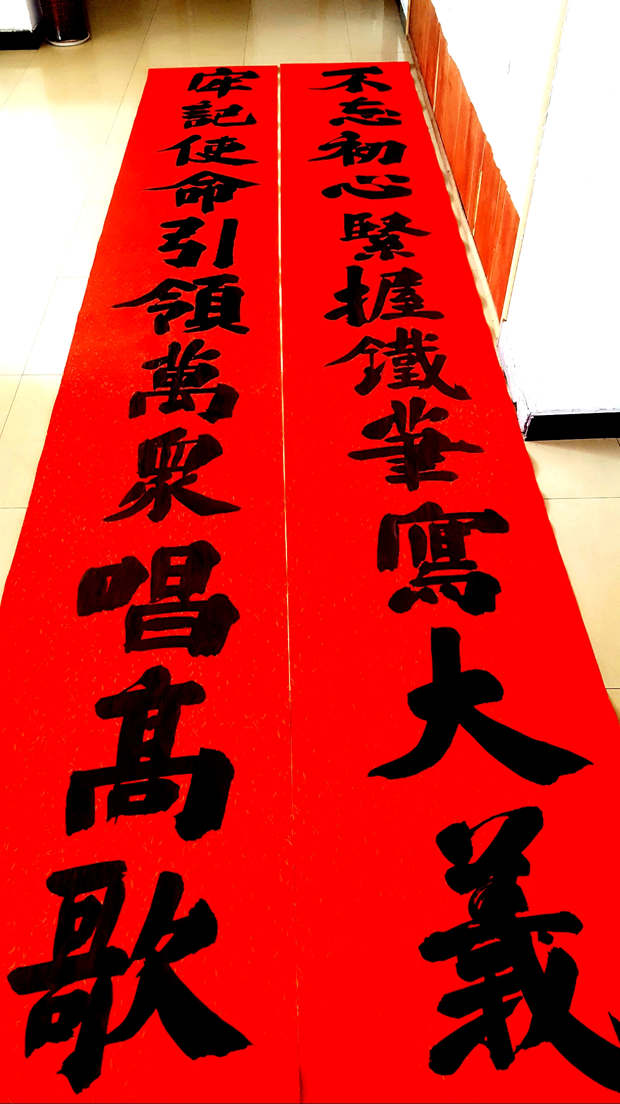邢懷章以歐陽通筆法融合魏碑,大楷榜書創(chuàng)作而成,春聯(lián)長達(dá)5米,每字徑80公分左右,一氣呵成,不計(jì)工拙,近兩個(gè)小時(shí)完成兩幅巨型春聯(lián),表達(dá)了對周口報(bào)業(yè)集團(tuán)的祝福,映出了喜慶的年味。