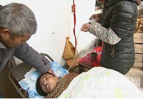 為給兒子治病,3年來(lái),家人花光了所有積蓄,借遍了所有親朋好友。由于無(wú)錢治療,張德印只好把兒子從醫(yī)院拉回家里照顧。和老伴兩個(gè)人護(hù)理他,為了給兒子張肖喂水,只有用針管進(jìn)行鼻飼,拉屎拉尿帶著尿布、下著尿,每天幾次換洗。