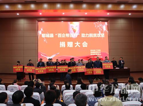 中華龍都網(wǎng)訊(周口報(bào)業(yè)全媒體記者 徐松 文/圖)4月13日,鄲城縣召開“百企幫百村”助力脫貧攻堅(jiān)捐贈(zèng)大會(huì),全縣129家企業(yè)反哺社會(huì)助力脫貧攻堅(jiān),現(xiàn)場(chǎng)捐贈(zèng)近1300萬元。鄲城縣四個(gè)班子領(lǐng)導(dǎo)、部分縣處級(jí)領(lǐng)導(dǎo)干部、縣慈善會(huì)會(huì)長、縣扶貧協(xié)會(huì)會(huì)長、縣直各單位和鄉(xiāng)鎮(zhèn)負(fù)責(zé)人等參加捐贈(zèng)大會(huì)??h委書記羅文閣發(fā)表講話,縣長李全林主持會(huì)議。