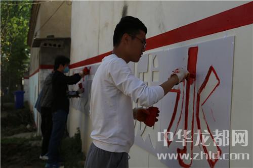 當日16時許,記者在該村看到,干凈整潔的水泥路像玉帶在村中盤旋,街道兩側栽植不久的小樹在向人們招手,坑塘四周干凈整潔,綠樹環(huán)繞,塘水清澈,梳理有致,房前屋后干凈整潔……天空中雖然下著雨,但是記者遠遠的就聽到了群眾的談笑聲和機械的轟鳴聲,走近,原來是村民們不顧天氣下雨,依然在自發(fā)地進行道路清理工作。記者看到,該村墻體文化更讓村子增加了很多的“內涵”。