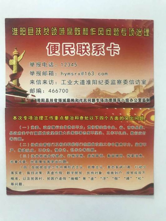 今年4月,淮陽(yáng)縣扶貧領(lǐng)域腐敗和作風(fēng)問(wèn)題專項(xiàng)治理全面啟動(dòng)。為確保專項(xiàng)治理取得實(shí)效,縣紀(jì)委監(jiān)委印制發(fā)放“便民聯(lián)系卡”,進(jìn)一步加大宣傳力度,暢通信訪舉報(bào)渠道。他們統(tǒng)一制作的扶貧領(lǐng)域腐敗和作風(fēng)問(wèn)題專項(xiàng)治理便民聯(lián)系卡,上面印有專項(xiàng)治理工作重點(diǎn)整治和查處的4個(gè)方面內(nèi)容。具體包括黨委、政府履行主體責(zé)任不力,脫貧攻堅(jiān)工作不扎實(shí),敷衍應(yīng)付;扶貧部門及相關(guān)職能部門脫貧攻堅(jiān)工作中不作為、慢作為、亂作為等;扶貧領(lǐng)域發(fā)生貪污侵占,虛報(bào)冒領(lǐng),截留挪用等問(wèn)題。聯(lián)系卡公布了舉報(bào)電話和來(lái)信來(lái)訪地址,方便群眾對(duì)黨員干部和部門的監(jiān)督。