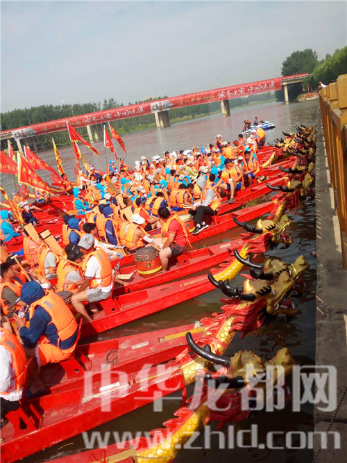 比賽開(kāi)始前,位于周口大道橋東側(cè)的中華龍舟大賽賽場(chǎng)已是喧聲鑼鼓,人海如潮,不少市民攜家?guī)Э谇皝?lái)觀戰(zhàn)。河中,二十多條龍舟整齊地排列在水面上。