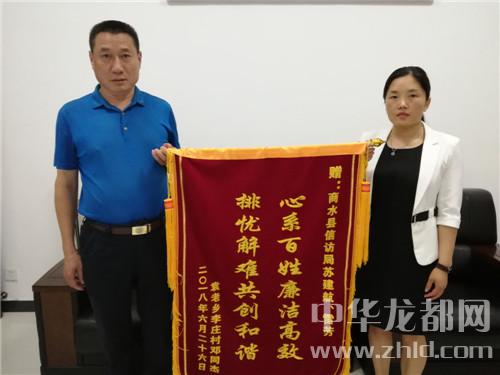 中華龍都網(wǎng)訊(周口報業(yè)全媒體記者 付永奇 通訊員魏紅 位慶華 )6月26日上午,商水縣信訪局門前鼓樂喧天、鞭炮齊鳴、人群涌動。其間,幾名群眾簇?fù)碇幻嫔蠒靶南蛋傩樟疂嵏咝艖n解難共創(chuàng)和諧”的錦旗徑自向商水縣信訪局走來。
