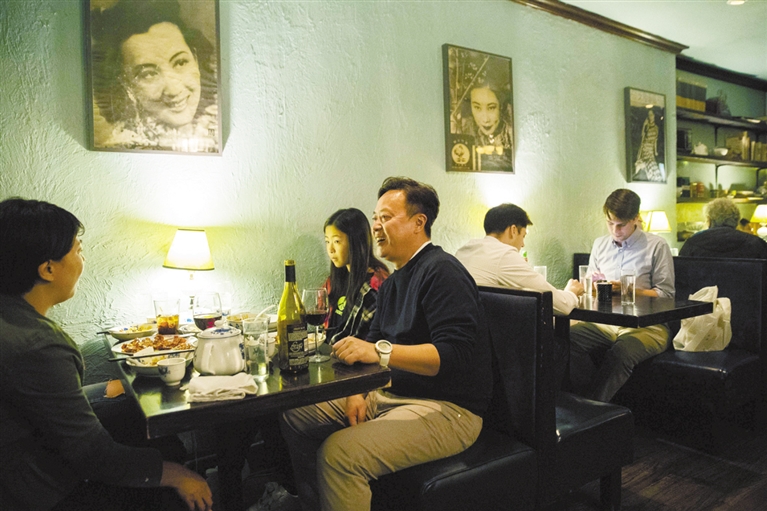這是食客們?cè)谖挥诿绹?guó)紐約的“傾城”餐廳享用晚餐(6月27日攝)。來自中國(guó)的王怡明和張弦夫婦辭去金融行業(yè)高薪工作,于2011年創(chuàng)辦了這家以張愛玲小說《傾城之戀》為靈感命名的中餐廳,用復(fù)古的電影海報(bào)和臺(tái)燈、照相機(jī)等老物件營(yíng)造出“中西合璧”的老上海風(fēng)情,多元和含蓄地展示店主鐘愛的文藝氛圍。新華社發(fā)
