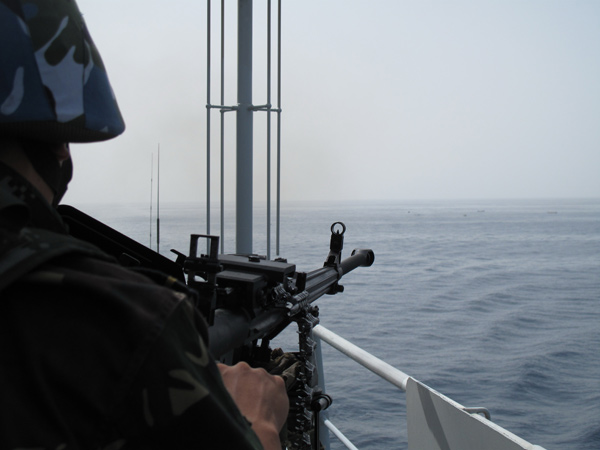 “噠噠噠……”,特戰(zhàn)隊員扣動扳機(jī),重機(jī)槍發(fā)出猛烈的怒吼,呼嘯而出的子彈在海盜快艇前筑起一道難以逾越的火線,海盜見狀,頓時慌了手腳,急忙調(diào)轉(zhuǎn)船頭,倉皇逃竄。