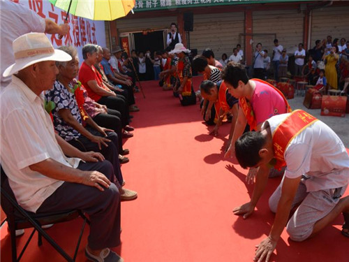 鄉(xiāng)長(zhǎng)吳國(guó)鋒發(fā)表了熱情洋溢的致辭。他首先代表平店鄉(xiāng)黨委、政府、人大向受到表彰的先進(jìn)模范和先進(jìn)家庭表示熱烈的祝賀并致以崇高的敬意。并詳細(xì)闡述了開展“孝善敬老讓愛回家、孝賢之星表彰授牌暨解決獨(dú)居老年人問題、助力脫貧攻堅(jiān)的重大意義,他希望受到表彰的先進(jìn)代表和家庭要珍惜榮譽(yù)、再接再厲,繼續(xù)弘揚(yáng)尊老、敬老、養(yǎng)老、愛老的傳統(tǒng)美德,推動(dòng)全鄉(xiāng)“孝善敬老”文化不斷邁向新臺(tái)階?;顒?dòng)現(xiàn)場(chǎng)宣讀了《平店鄉(xiāng)人民政府敦促將被贍養(yǎng)人接入安全住房共同生活的通告》;與會(huì)領(lǐng)導(dǎo)為孝賢之家頒獎(jiǎng)授牌;28個(gè)“孝子孝媳”在臺(tái)上統(tǒng)一施行叩拜大禮;活動(dòng)結(jié)束后,鄉(xiāng)政府指派3名班子領(lǐng)導(dǎo)和10多名工作人員,分別乘坐6臺(tái)輛,由嗩吶隊(duì)開路,風(fēng)風(fēng)光光把28個(gè)老人送回了家。一路引來(lái)不少群眾駐足注目觀看,廣大群眾對(duì)此嘖嘖稱贊、拍手稱快。