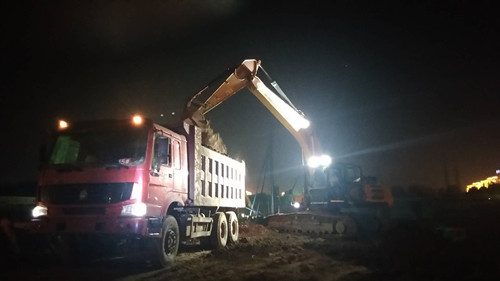 在德和家園施工現(xiàn)場(chǎng),雖近22時(shí),挖掘機(jī)依然揮舞著鐵臂在不停地挖土,渣土車(chē)來(lái)來(lái)往往地運(yùn)送著土方,靜謐的夜空在德和家園的施工現(xiàn)場(chǎng)也躁動(dòng)起來(lái)。