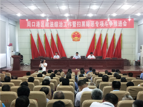 9月6日,周口港區(qū)召開政法綜治工作暨掃黑除惡專項斗爭推進會議。港區(qū)黨委書記孫紅偉出席會議并講話,紀委書記尚紅偉主持會議。港區(qū)公安分局政委何學民對掃黑除惡工作做具體部署。港區(qū)直屬各單位、市直派駐機構負責人,公安、城管、消防、李埠口鄉(xiāng)全體黨員干部,各行政村主要負責人和村治保主任等近300人參加會議。