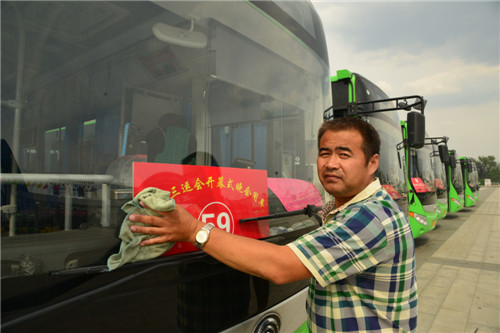 隨著省第十三屆運動會開幕式臨近,近日,市公交總公司接送演職人員的公交車已經(jīng)增至近百輛,這些公交車的司機每天都要工作到午夜2時許。據(jù)悉,從今年4月份省運會先期比賽項目開賽以來,市公交總公司已為省運會出動公交車2800臺班,中心城區(qū)公交候車亭提升改造工程也正在快速推進中。圖為市公交二公司的劉師傅利用閑暇時間擦車。②5記者 梁照曾 攝