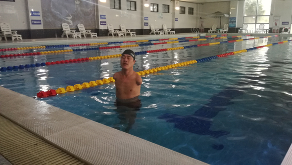 本報訊 10月16日上午,市體育中心游泳館一訓(xùn)練池內(nèi),一名運動員正用不同尋常的泳姿在賽道內(nèi)訓(xùn)練。只見他雙腳奮力踏水,努力保持身體平衡,到達終點時,這名運動員不是用手觸壁,而是用頭部觸壁。當他站起身時,人們才發(fā)現(xiàn)他是一名失去雙臂的殘疾運動員。他就是我市備戰(zhàn)省第七屆殘運會的運動員島建書。