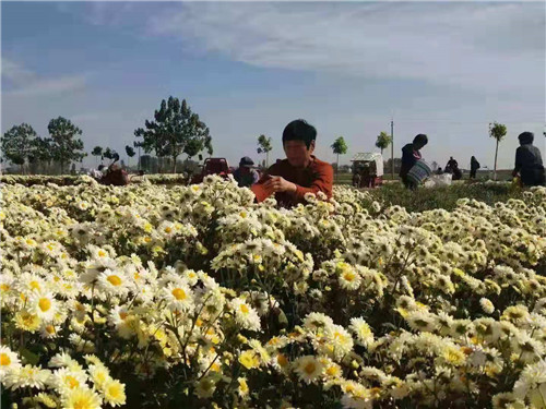 當(dāng)日,位于高集鄉(xiāng)北部的黨橋、雙堂等幾個行政村,也是熱鬧非凡。一臺臺大小不同的車輛,滿載著剛從地里摘下的鮮菊花,正往富甲一方菊花加工廠里銷售,縷縷的菊花清香隨風(fēng)飄來,煞是誘人。在富甲一方合作社帶動下,今年有16戶貧困戶種植80多畝菊花,鄉(xiāng)政府對首次種植的貧困戶負(fù)責(zé)技術(shù)培訓(xùn),并給予每畝1000元的生產(chǎn)獎補(bǔ)。今年菊花每公斤4元左右,麥茬種植菊花每畝可產(chǎn)鮮菊1100-1300公斤,去掉雇人摘菊花費用每公斤0.3元,每畝可收入4000-5000元。種植菊花的貧困戶孫建國在富甲一方收購現(xiàn)場,正樂呵呵的數(shù)著賣菊花得來的大把鈔票。