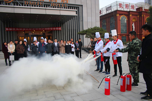 在培訓(xùn)現(xiàn)場(chǎng),為更好地將學(xué)到的知識(shí)與實(shí)踐相結(jié)合,大隊(duì)宣傳人員組織參訓(xùn)人員開(kāi)展了實(shí)地滅火消防演練,酒店全體員工分批次輪番上陣,通過(guò)使用滅火器及時(shí)迅速地?fù)錅缁馂?zāi)操練,提高參訓(xùn)人員正確規(guī)范使用滅火器材的能力,達(dá)到了良好效果。