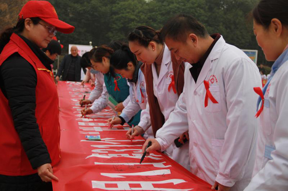 圖為在趕來參加活動(dòng)的群眾和醫(yī)護(hù)人員共同在預(yù)防艾滋病百米長(zhǎng)卷上簽名。